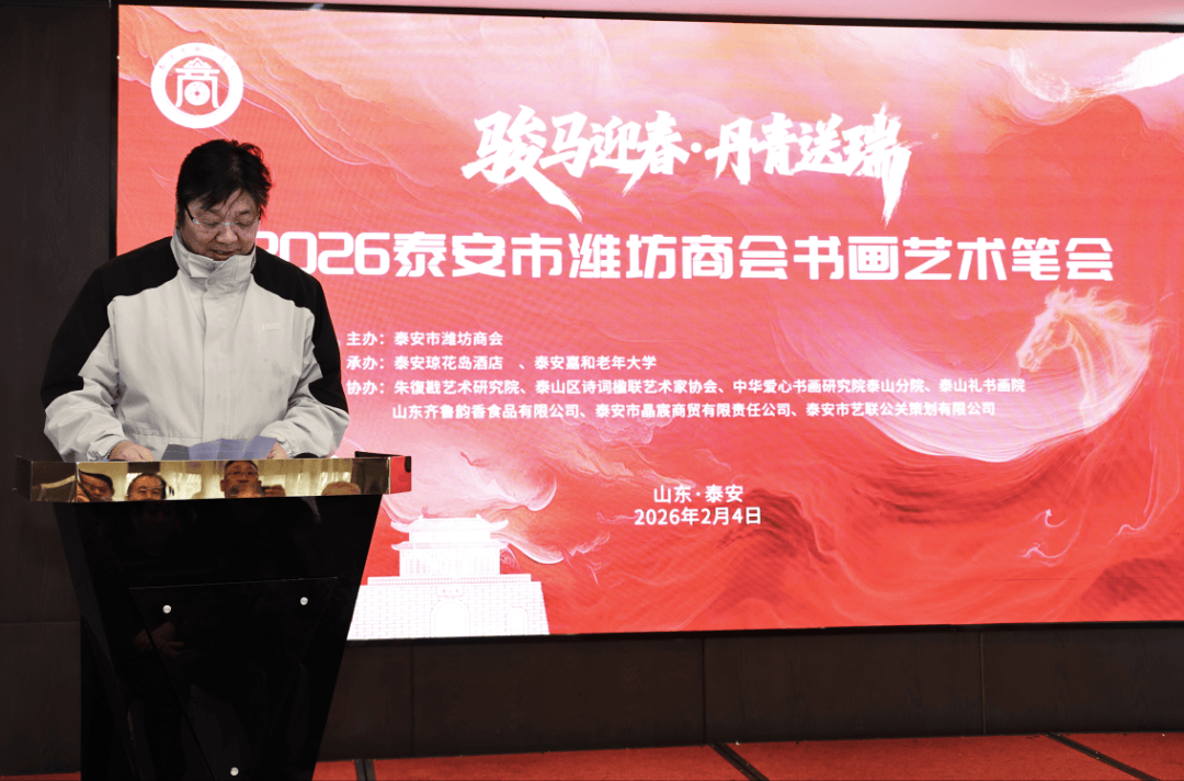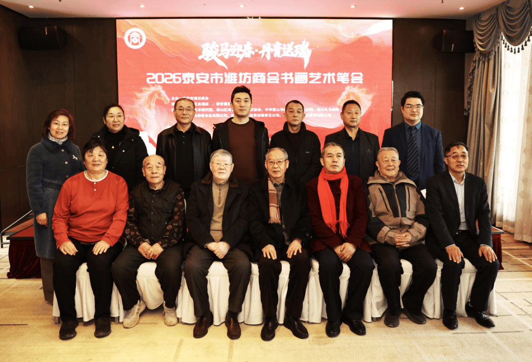 春潮涌动,墨香满庭;乡音未改,情谊绵长。甲辰马年新春前夕,2月4日,泰安市潍坊商会2026年“骏马迎春·丹青送瑞”迎新春送祝福书画艺术笔会在琼花岛酒店圆满落幕。这场商会换届后的重磅文化活动,以书画为媒、以新春为契,汇聚原市级老同志张庆明、孙士杰先生,孔祥湖先生、赵中梅女士以及何树华、路洪祥、吕大明、张范义、李光富、公茂坤等一众书画名家,商会各位会长、同仁及主办方工作人员宗建、李振亭、景春梅,在笔墨流转间传递美好祈愿,在文化交融中凝聚发展共识,既为泰安与潍坊两地情谊添上浓墨重彩的一笔,更为商会新征程注入了蓬勃的文化活力与奋进力量。