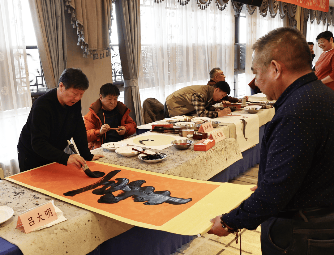 现场,何树华、吴金满、路洪祥、吕大明、赵立新、甄立明等十余位书画名家凝神聚力、挥毫泼墨,或伏案疾书,或提笔构思,一笔一划间尽显深厚功底。何树华先生绘就骏马图,笔墨简练遒劲,形神兼备,寄寓龙马奋进、家国腾跃的美好期许;路洪祥先生的隶书《敦睦乡谊》古朴厚重,尽显乡情绵长的深厚底蕴;