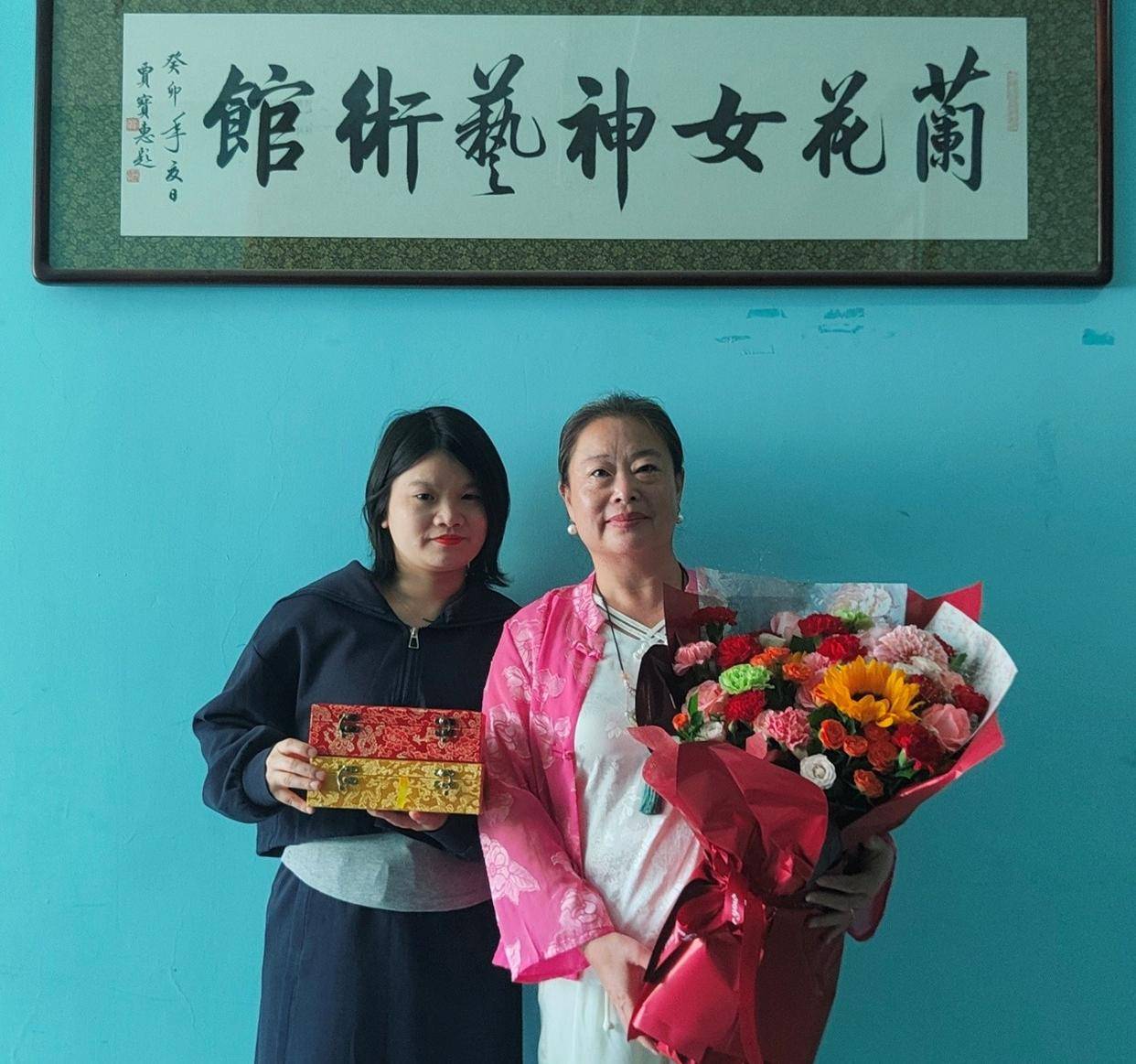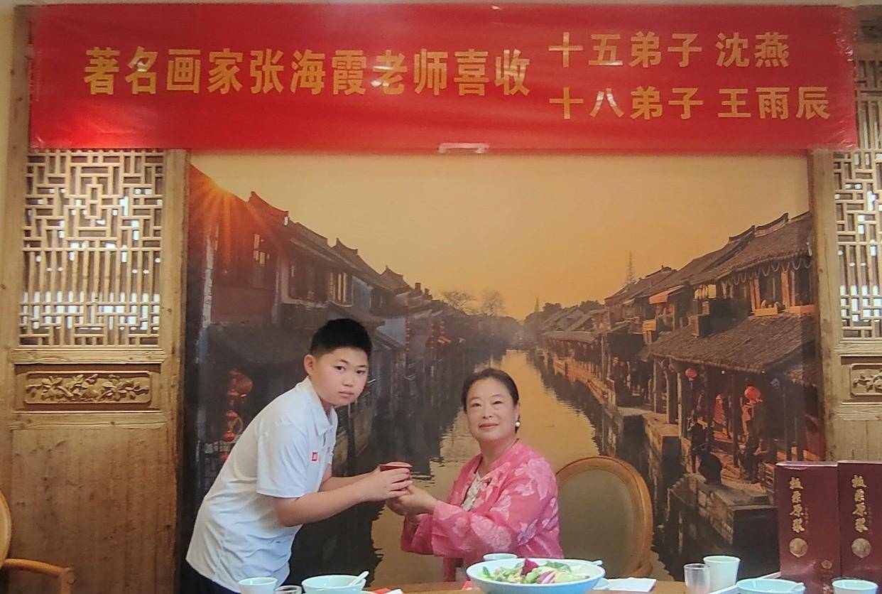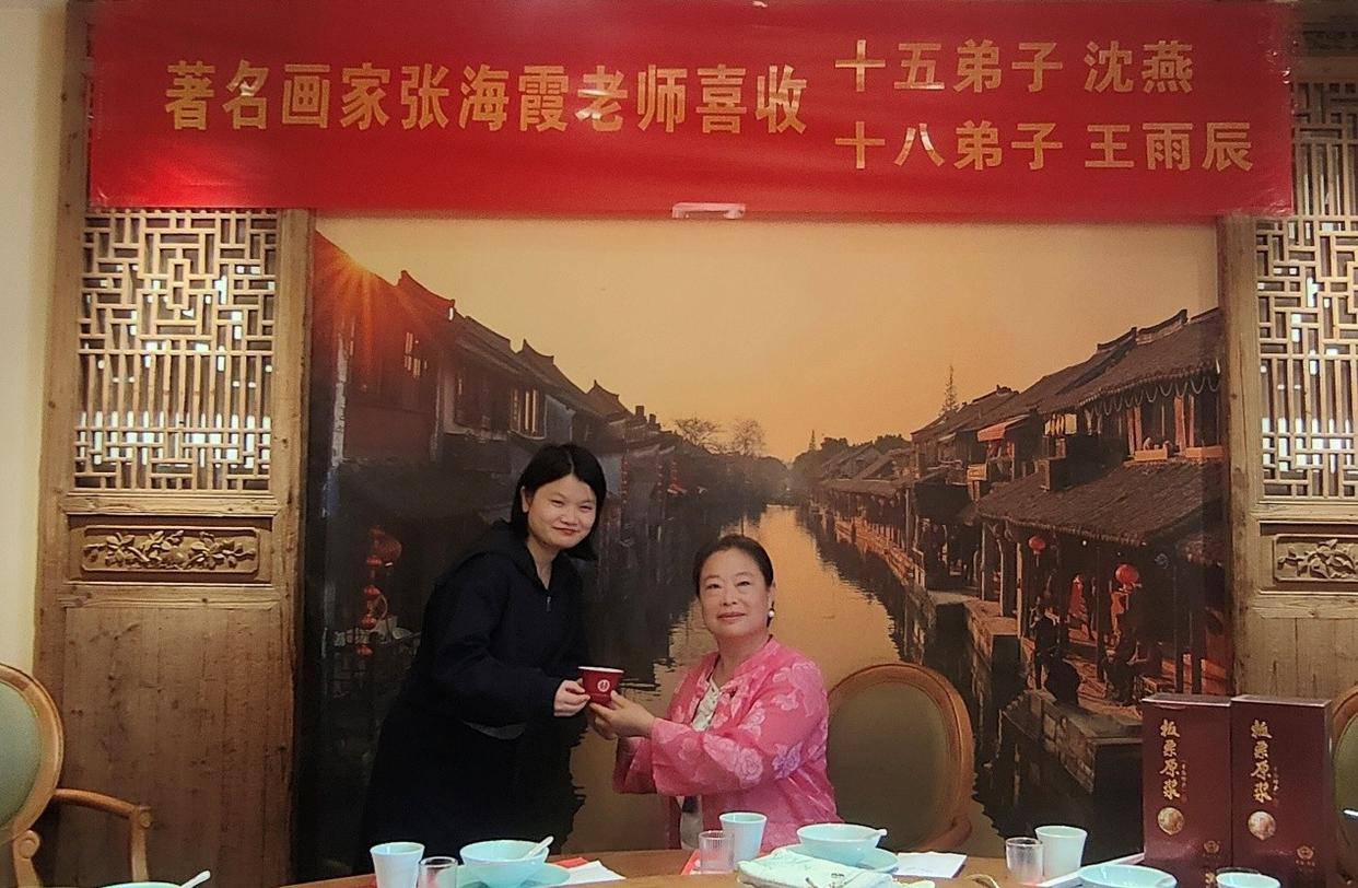 一礼一敬,传承的是技艺更是初心,仪式现场遵循传统礼仪,处处透着对艺术的敬畏。张海霞女士端坐主位,神情肃穆。新弟子沈燕、吴超从容地依次上前,向师父行鞠躬礼、敬拜师茶。袅袅茶香中,每一个动作都饱含着对师父的敬重,更藏着传承艺术的坚定决心。